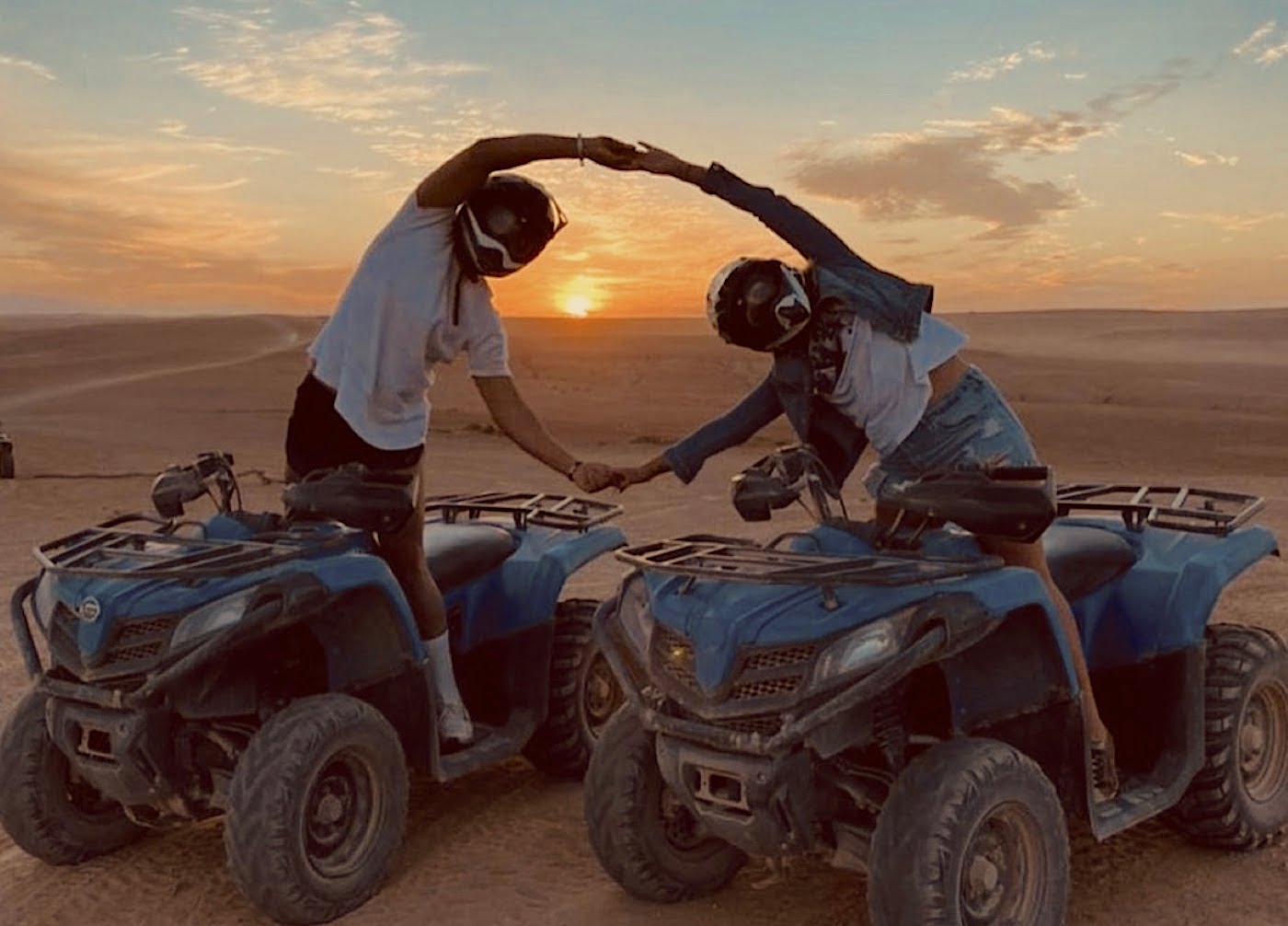 Après le vol, partez pour une balade en quad à travers les paysages lunaires d’Agafay, entre pistes, collines et panoramas naturels.